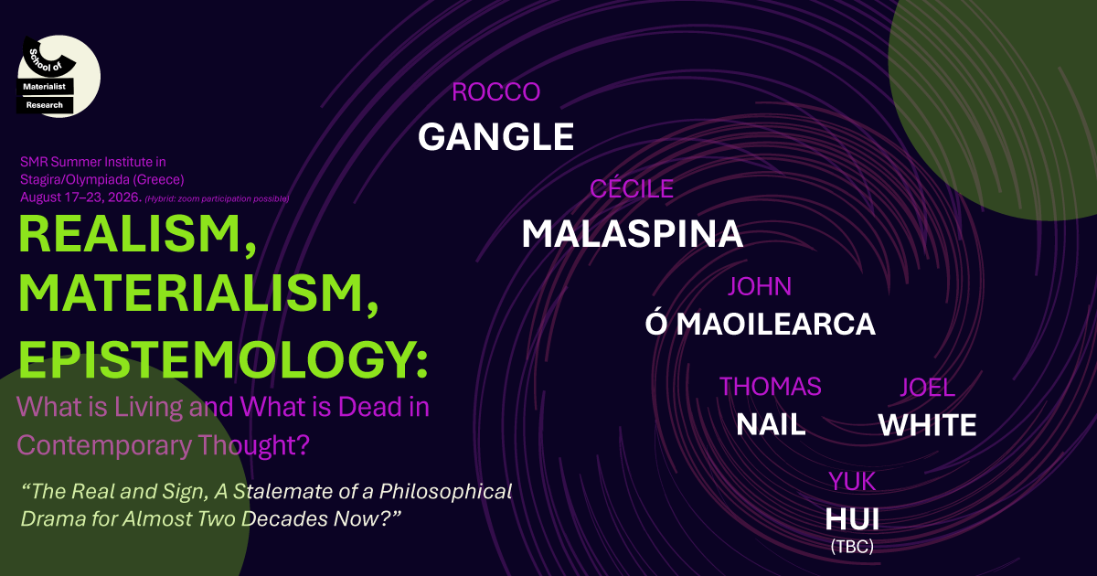"Realism, Materialism, Epistemology: What is Living and What is Dead in Contemporary Thought?," is the title of a summer school, part of the SMR Summer Institute in Stagira/Olympiada (Greece), scheduled for August 17–23, 2026. It will explore the 21st century provocations and challenges to the dominance of the poststructuralist epistem across the humanities, social sciences, political philosophy, and beyond. This event invites us to delve into the motivations or epistemic necessities inspiring movements like speculative realism (SR), non-philosophy or non-standard philosophy, new materialisms (Utrecht school, Barad, vibrant matter), Lacanian realism, kinetic materialism, xenofeminism and/or accelerationism, and most recently cosmotechnics as an epistemological shift. We do not intend to study any of these strands of thought as subject matter of the school but state them as a non-exhaustive list of what we consider to be symptoms of the crisis of the poststructuralist (maybe even postmodern?) epistemic hegemony. Many have since moved away from either SR, non-philosophy or non-standard philosophy or from feminist materialisms, but their links with sciences have become even stronger. Even without embracing an ontology of materialism, the link with the sciences via the interrogations of material reality seems to ensure some connection with the interrogations of the real or in terms of the real, or even physicality as opposed to the spectral selfufficency of the universe of language, signification, Sign. Present currents engage with hard sciences and technology and some with Marxism or both with STEM and Marxism, challenging the hegemony of poststructuralism’s authority without fully displacing it. What unites these shifts, and how do we name this evolving paradigm which emerges perhaps even before the so-called "speculative turn" and the rest that followed? Confirmed speakers: Rocco Gangle, John Ó Maoilearca, Thomas Nail, Cecile Malaspina, Joel White, Yuk Hui (pending reconfirmation).